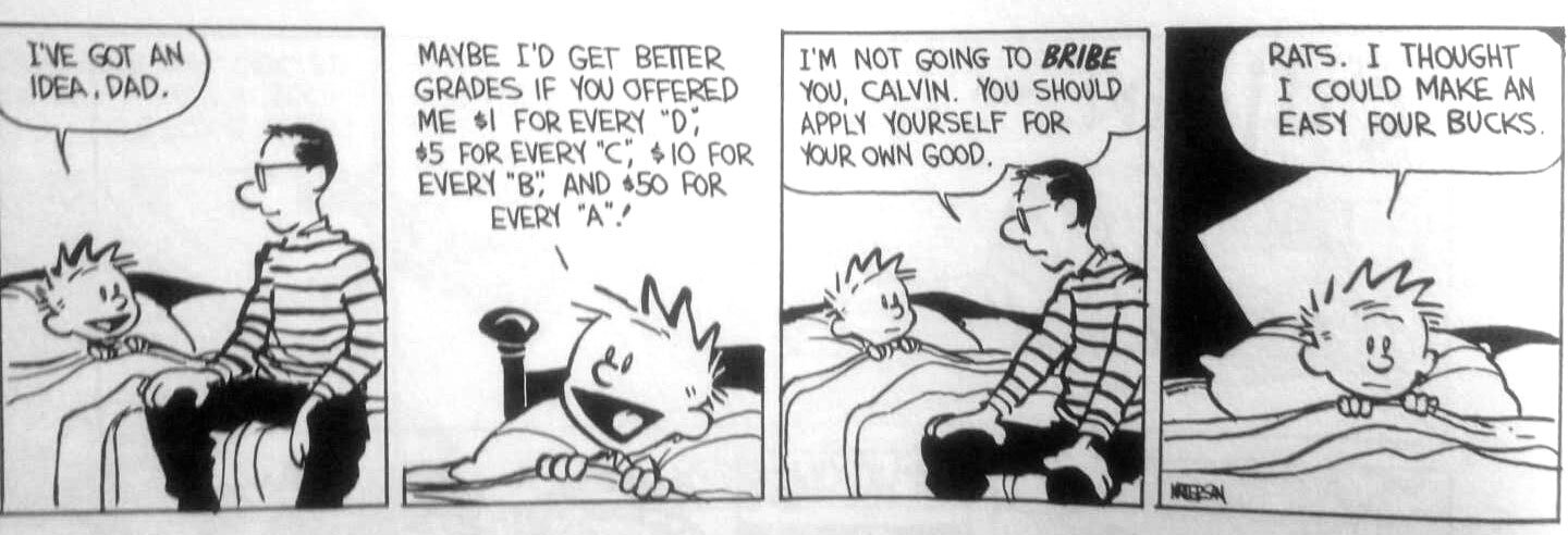 Someone who is motivated extrinsically is connecting behavior with an outcome. For example, they would go to school and complete assignments for something else external. Meaning, they go to class to get an “A” or even to receive their degree. The problem with this way of thinking is that everything between actions, and the outcome of those actions, is seen as an obstacle. From this perspective, the skill’s strength is what allows this person to get what they want. Consequently, the moment that skill is not enough to get them to their want, motivation fizzles out.